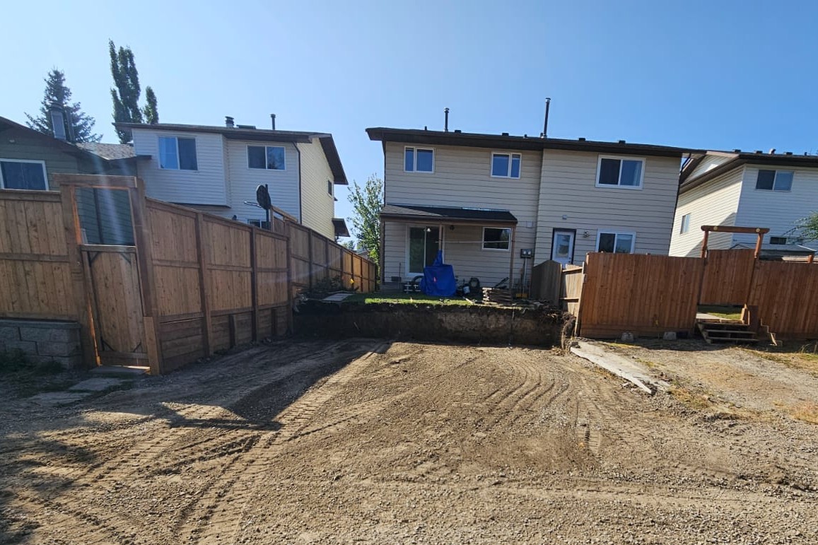 We began by removing the existing concrete pad, followed by the old retaining wall, which was damaged and deteriorating. After clearing out all shrubs and structures, our team started the excavation process, carefully shaping a smooth slope toward the back alley.