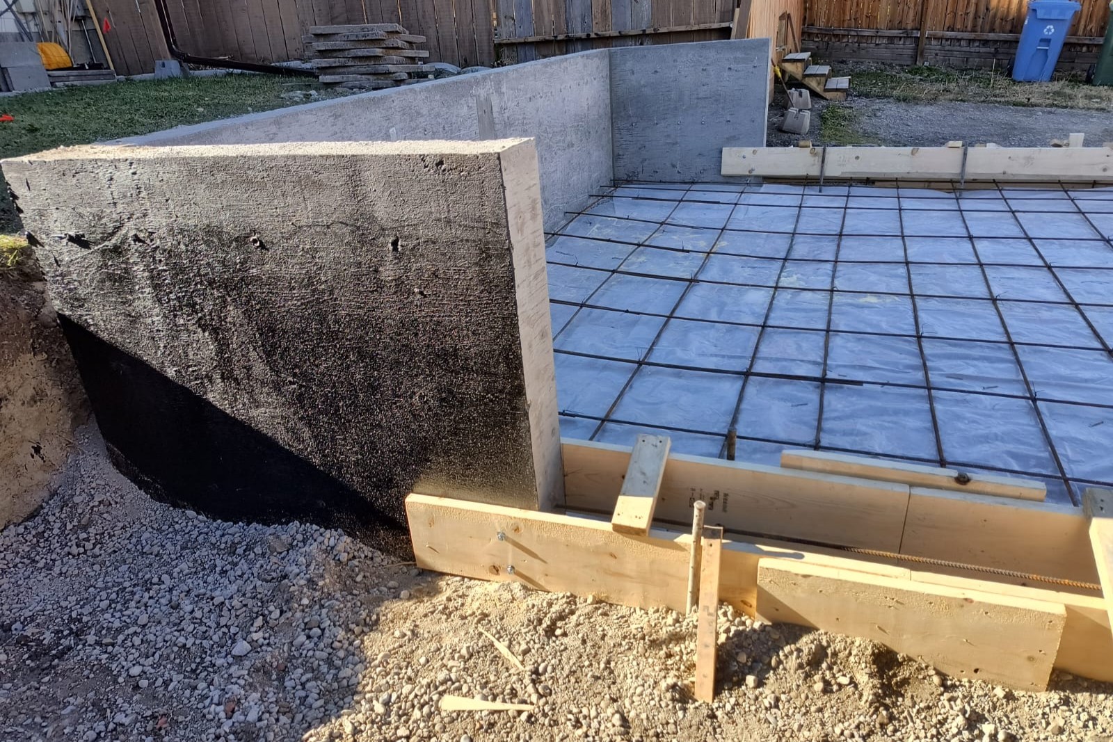 The next step is concrete formwork installation and concrete wall construction. This is a multi-step process that requires adequate time for the concrete to cure before the next pour. We ensured that reinforcing steel (rebar) was properly installed, along with a polyethylene vapour barrier, and applied bitumen sealant for additional protection of the retaining wall. The final steps in the concrete process included applying a surface sealant to the pad and cutting control joints to help manage cracking.