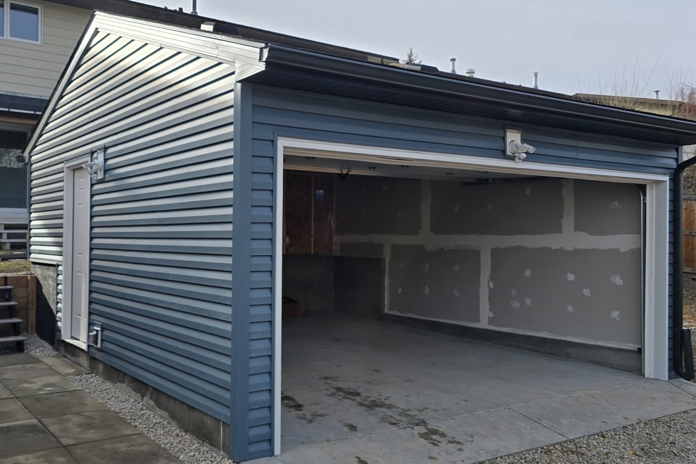 The customers decided to choose a different color for the garage siding, selecting a beautiful shade of blue. This choice not only complements the surrounding landscaping but also enhances the overall aesthetic of the property. The rich blue tone, complemented by dark aluminum accents, adds a sense of elegance and luxury to the garage exterior, creating a cohesive and visually appealing look that blends seamlessly with the yard and elevates the home’s curb appeal.