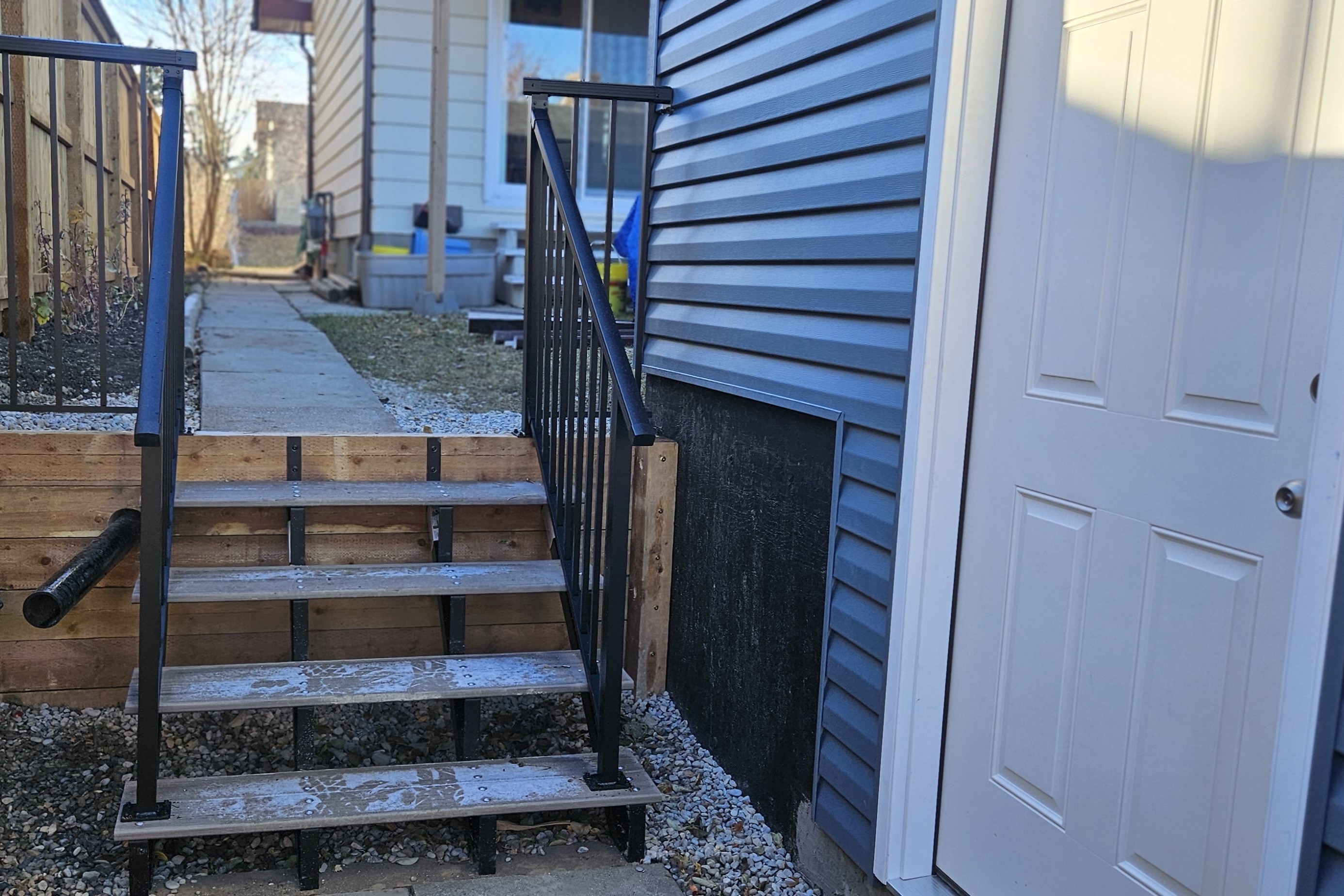 Meanwhile, exterior work was completed to create a walkway area leading to the garage and alleyway. First, a wooden retaining wall was constructed, followed by the installation of new, durable composite steps. The steps were finished with a sleek aluminum railing for a modern touch. The walkway was completed using a combination of gravel and concrete paving tiles, resulting in a clean, polished, and visually appealing finish.