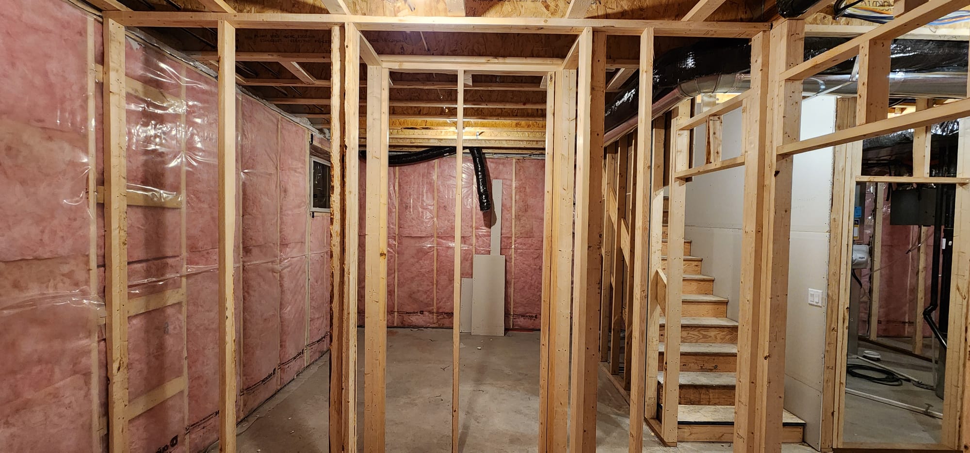 We began the basement development by carefully clearing the space and addressing any existing issue. For this project, we had to rebuild the existing stud walls to ensure they were plumb, creating straighter lines and sharper corners.