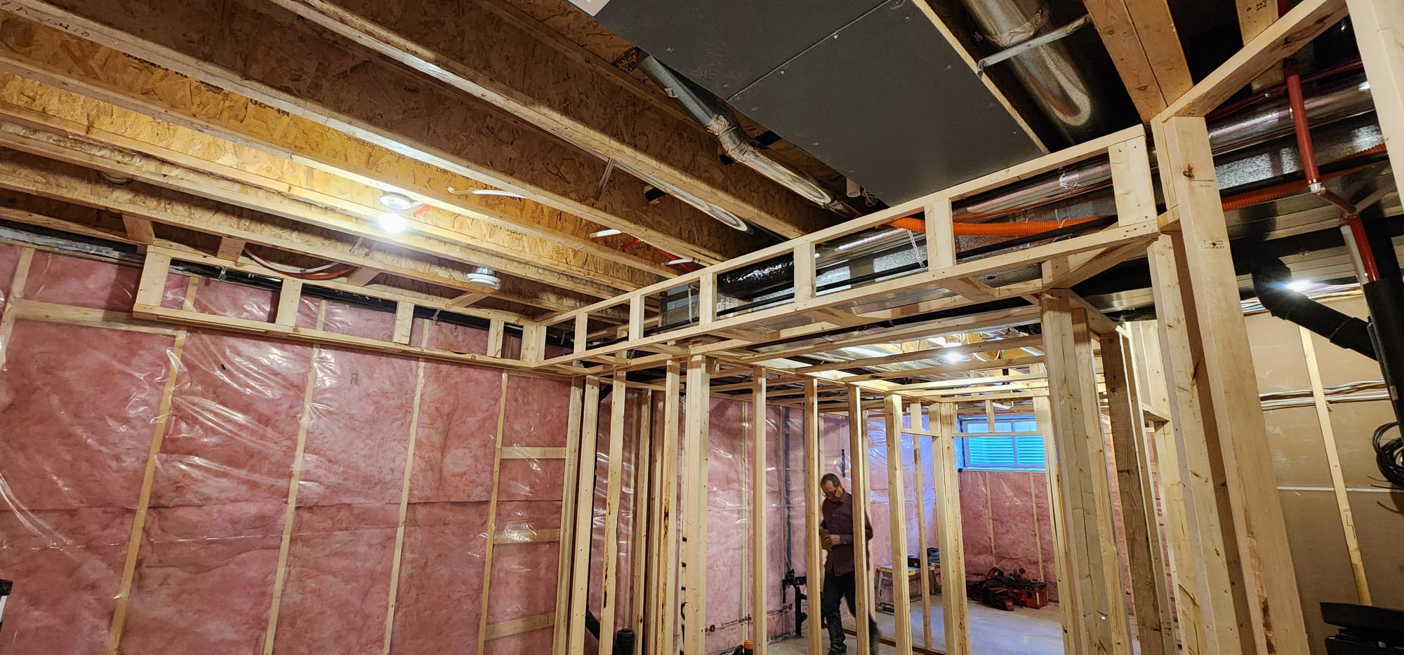 Next, the team focused on reconfiguring the layout to maximize functionality. This included creating distinct zones for family gatherings, entertainment, and storage while improving circulation and natural light wherever possible. We constructed the new walls, rearranging ductwork where necessary to optimize the space. We also built custom boxes to conceal ceiling lines and ductwork, carefully maintaining the ceiling height to ensure the basement remained open and comfortable.